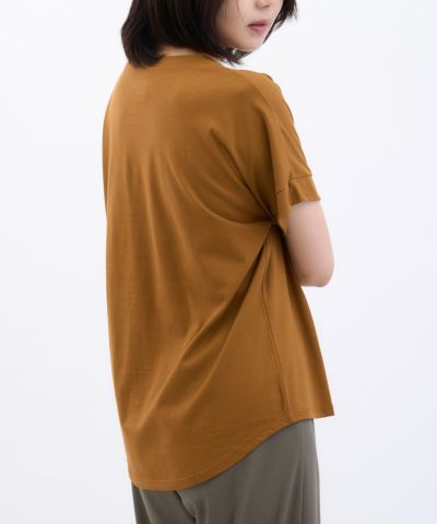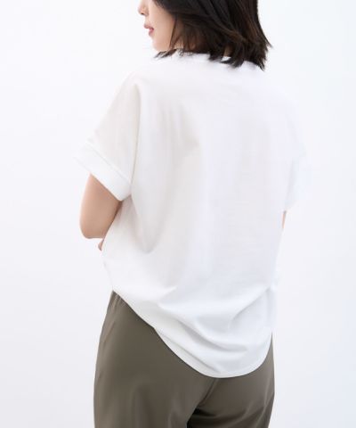 接触冷感素材で、ひんやり涼しい日本製カットソー。 クールローレルという生地を使用。 特徴は、肌に触れると冷たく感じる接触冷感素材。 シルクを思わせるような光沢感も魅力。 洗濯を繰り返しても毛羽が少ないです。 シルエットは肩に切替をつけず、袖口は広めにすることで、空気も入りやすい仕様に。 前裾は真っ直ぐで、後ろの裾はカーブをつけ、ヒップに被る位でメリハリを付けています。 前をインしなくても、バランスの取りやすいデザインです。