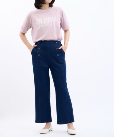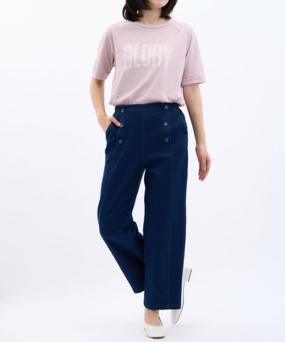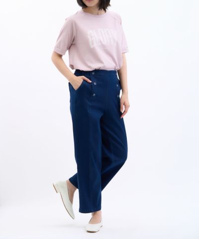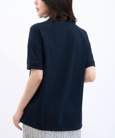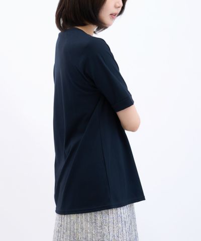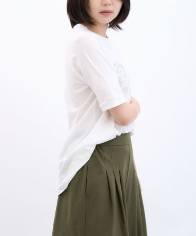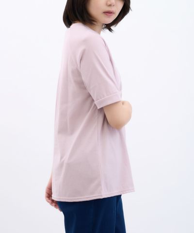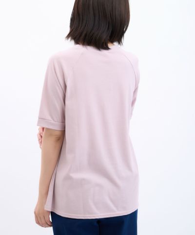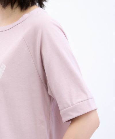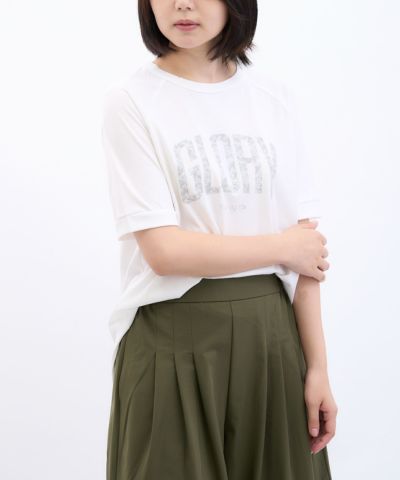 接触冷感素材で、ひんやり涼しい日本製カットソー。 クールローレルという生地を使用。 特徴は、肌に触れると冷たく感じる接触冷感素材。 シルクを思わせるような光沢感も魅力。 洗濯を繰り返しても毛羽が少ないです。 ラグランスリーブで動きやすく、裾にかけて若干Aライン気味に広がり、ゆとりがあるデザイン。 ロゴも大きめでカジュアルな印象ですが、素材の光沢感で、お家のくつろぎタイムにはもちろん、お出かけスタイルにもお使いいただけます。