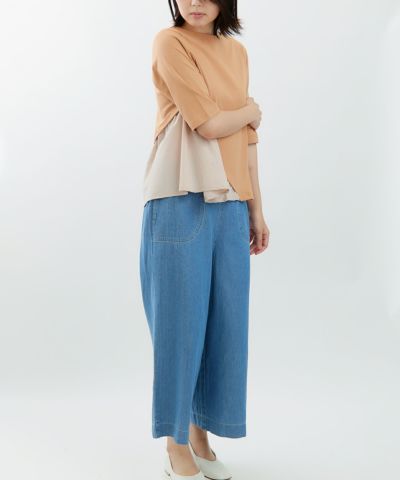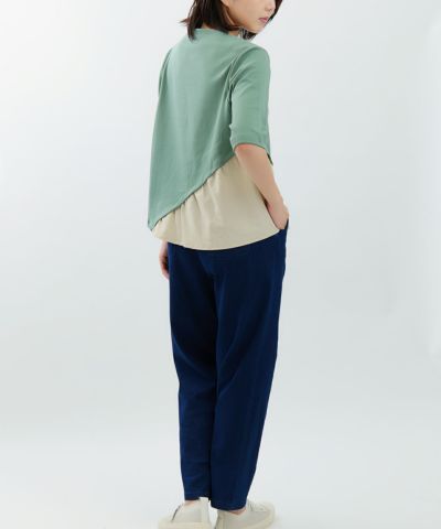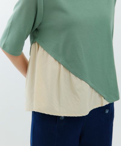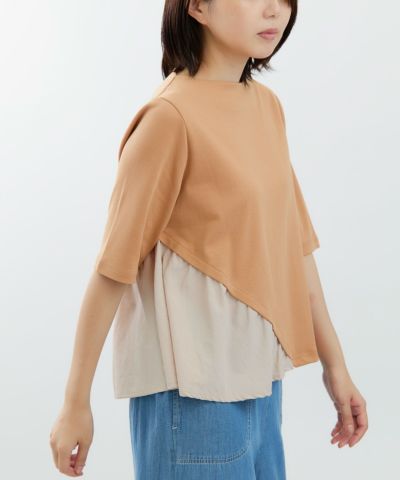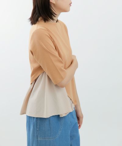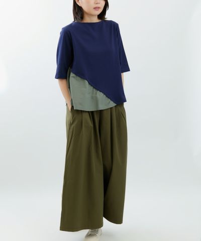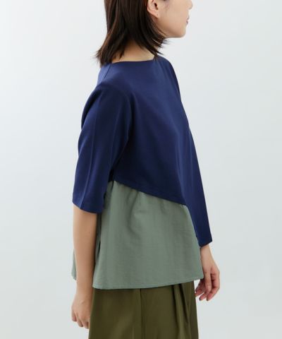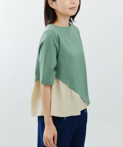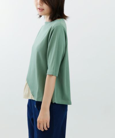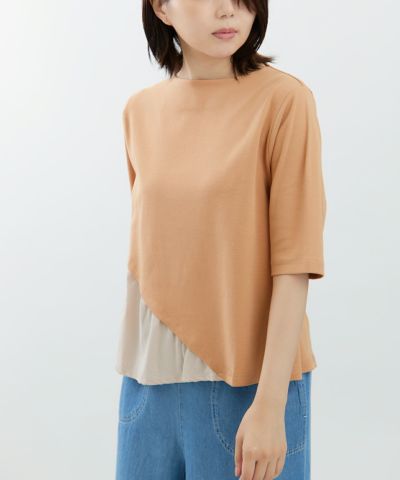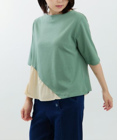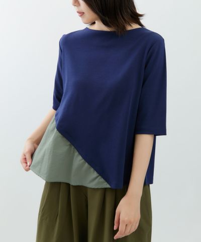 切替が大人カワイイ、ボートネックプルオーバー。 襟元が開き過ぎないボートネックで、すっきりとした印象。 袖丈は安心の5分袖。コンパクトな着丈で、ワイドパンツやスカートでもバランス良く着用いただけます。 斜めに素材を変えた切替をいれ、暑さが残る季節も映えるカットソーです。