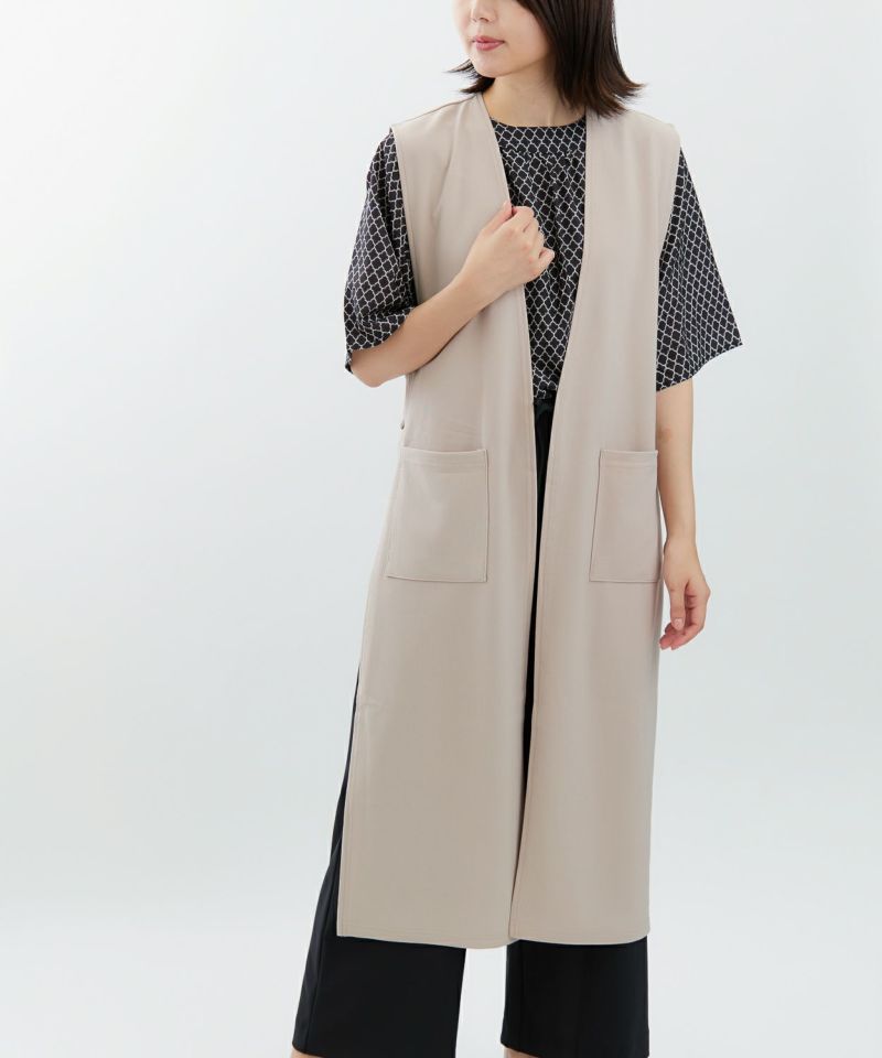 長い季節楽しめる、ロングジレ。 カジュアルなTシャツに羽織るだけで、こなれ感とオシャレ度UP。 後ろのベルトデザインで、メリハリを出し、軽やかな印象。 同系色のワンピースに合わせれば、縦長効果が更に増します。 シワになりにくい素材で、取り扱いも安心です。