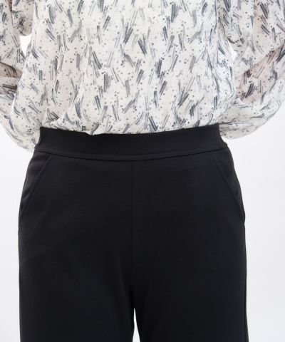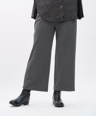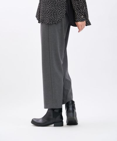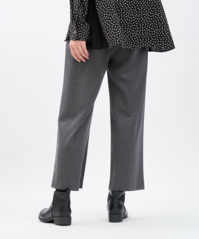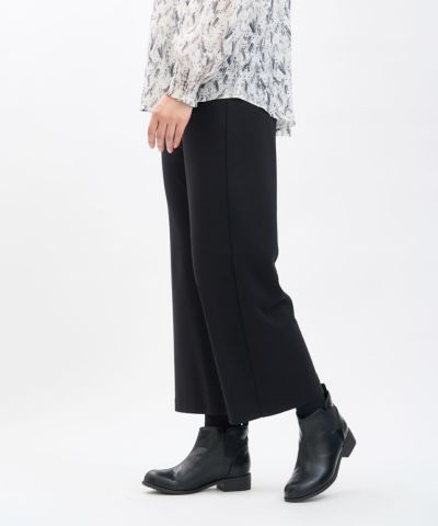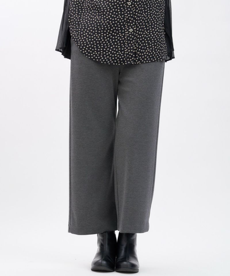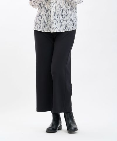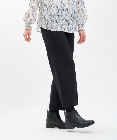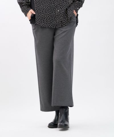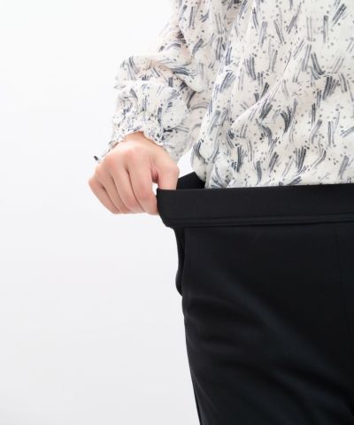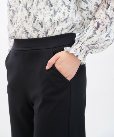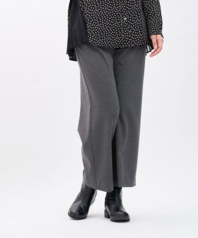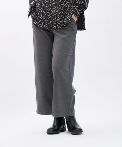 裾幅が26センチと広すぎず、落ち感があり、ジャージ素材でもカジュアルに偏らず、着まわしの効くデザイン。 ポンチ素材は、ハリ感があり、ストレッチ性も高い生地。 横伸びが少なく、伸縮性があるため保形成に優れた型崩れしにくい編み地。 ストレッチが効いているため、動きやすく、長時間履くにも負担なく着られます。 ウエストからストンと真っ直ぐなラインが出来、スッキリ感のあるスタイルです。 キレイめブラウスやプリントのトップスと合わせると非常に楽な通勤、お出かけスタイルに。