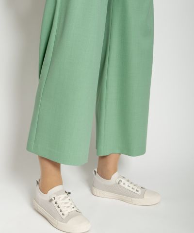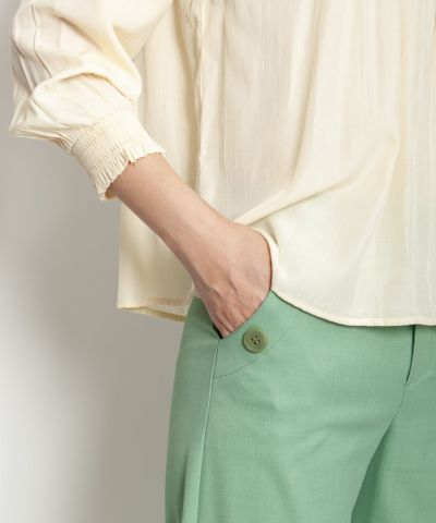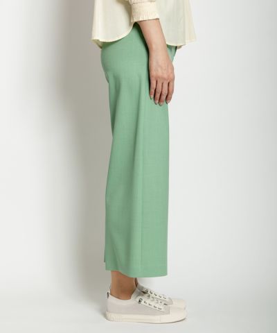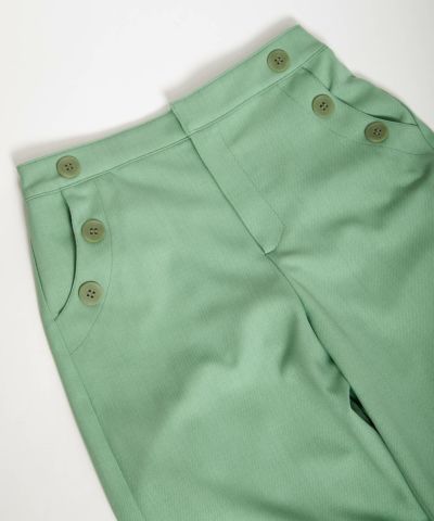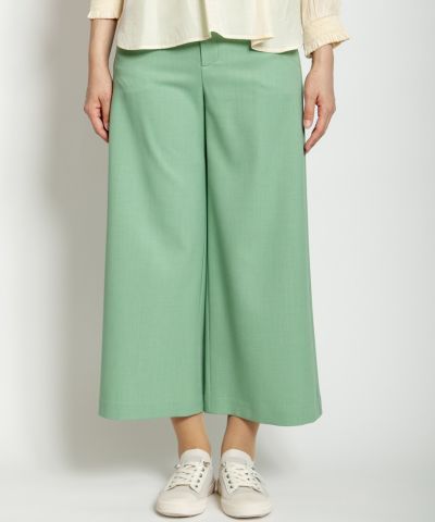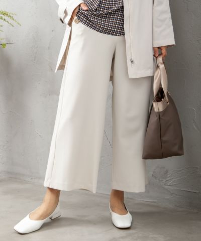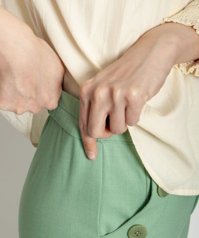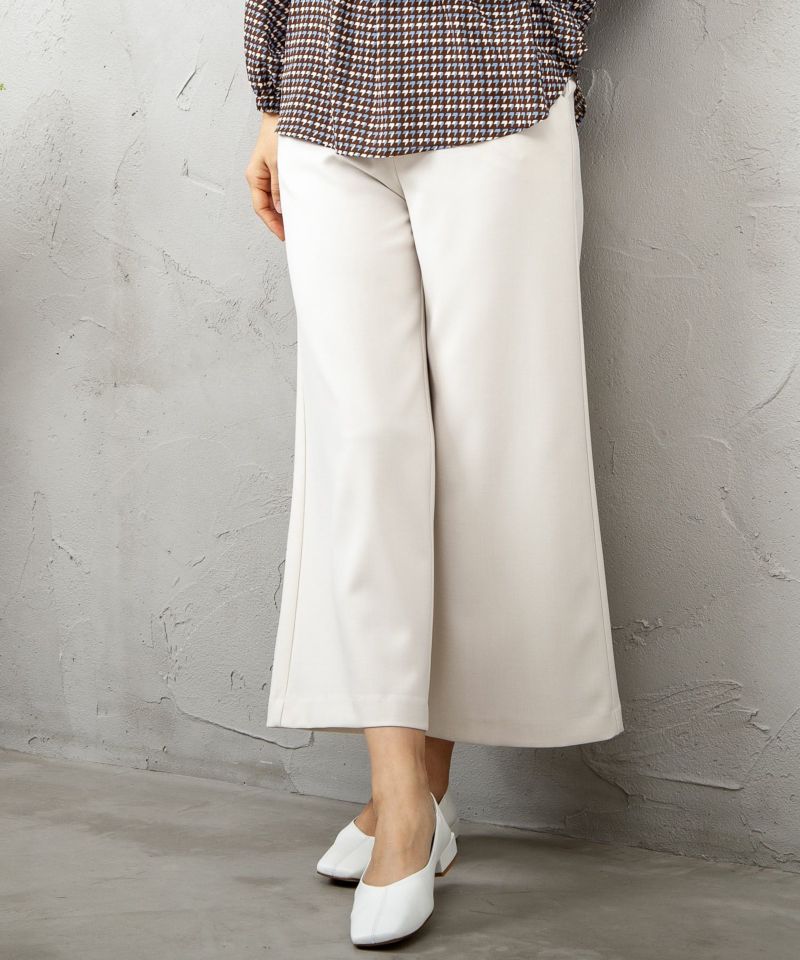 マリン風ワイドクロプトパンツ。 ポケットのボタン使いで、デザイン性もありお腹をすっきり見せる効果も。 素材は非常に軽く、肌触りも良いです。後がゴム仕様で着心地も楽に。
