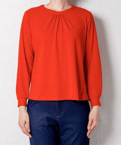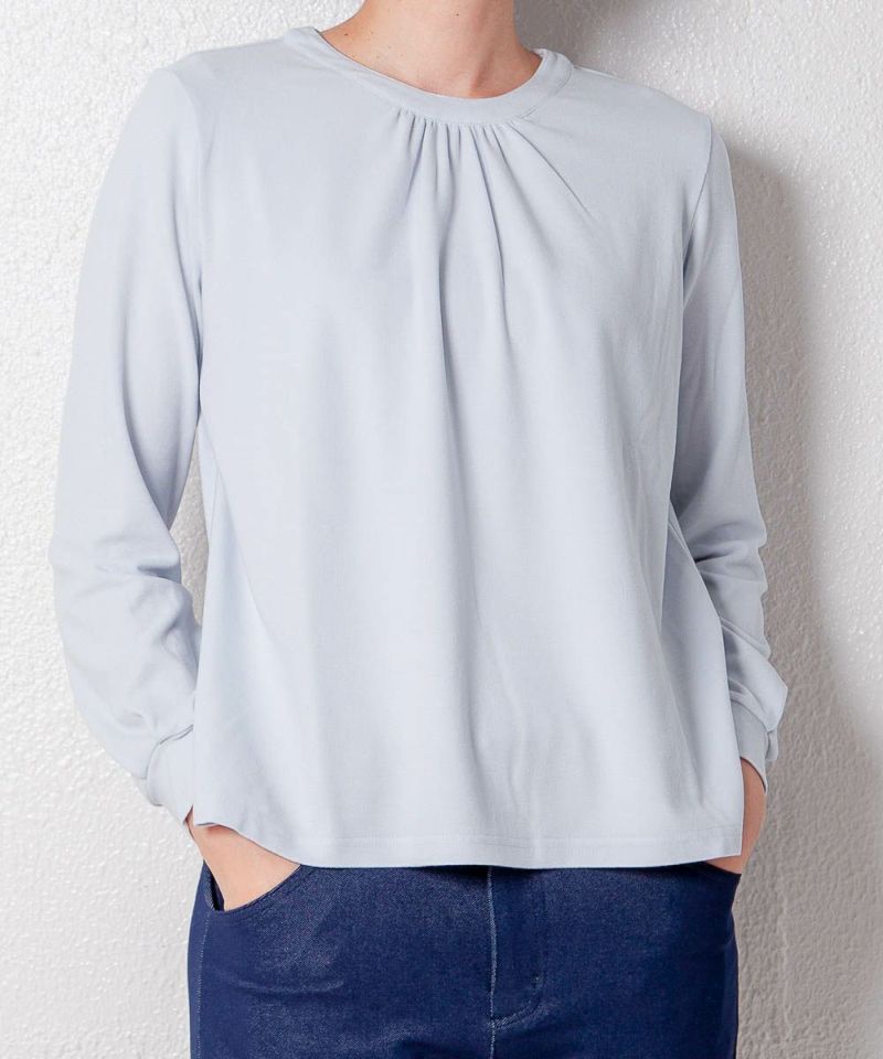 首ぐりにギャザーを入れ、体の厚みを自然にカバーしてくれるプルオーバー。