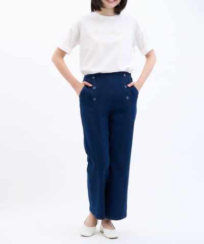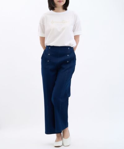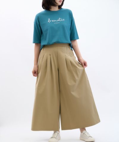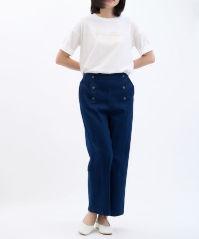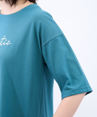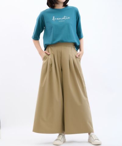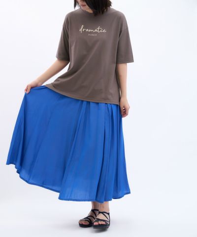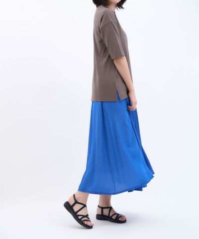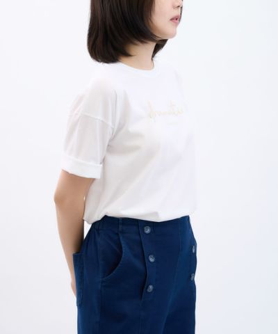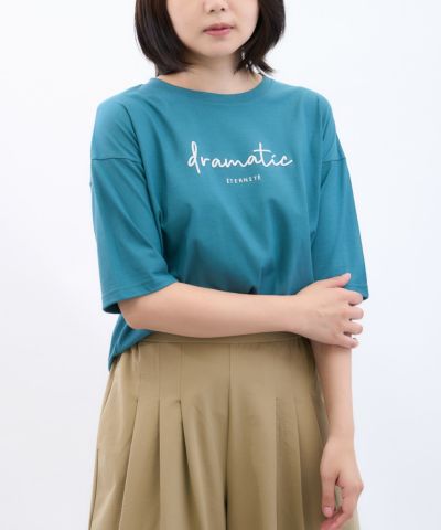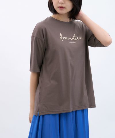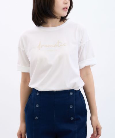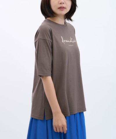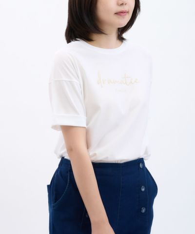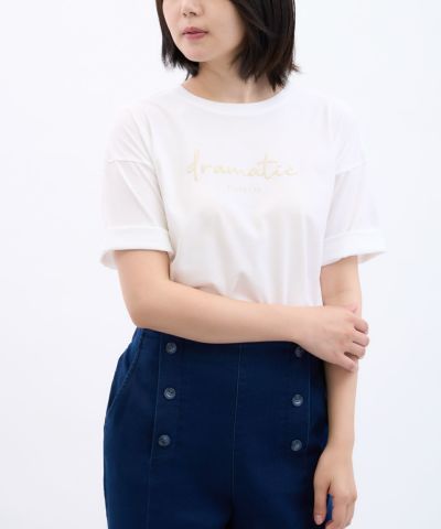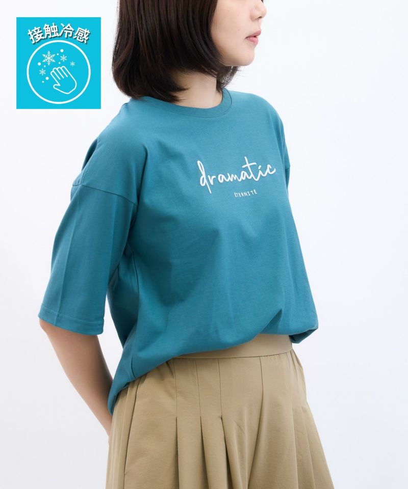 接触冷感素材で、ひんやり涼しい日本製カットソー。 クールローレルという生地を使用。 特徴は、肌に触れると冷たく感じる接触冷感素材。 シルクを思わせるような光沢感も魅力。 洗濯を繰り返しても毛羽が少ないです。 シンプルなクルーネックに発泡プリントのロゴ入りカットソー。 ドロップショルダーの5分袖で肘が隠れる袖丈。 袖はロールアップし、抜け感を出すのもおすすめ。 ボトムはスカート、パンツどちらでもシンプルなので合わせやすいです。