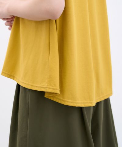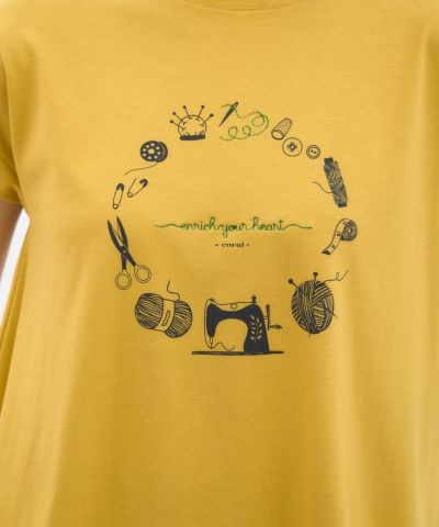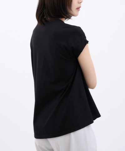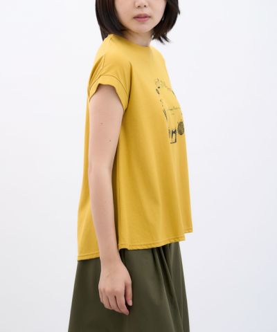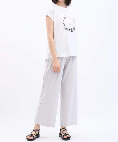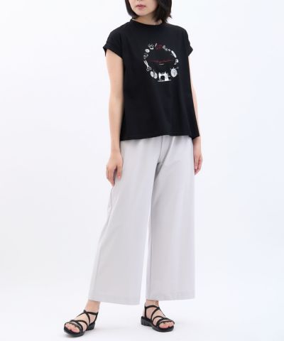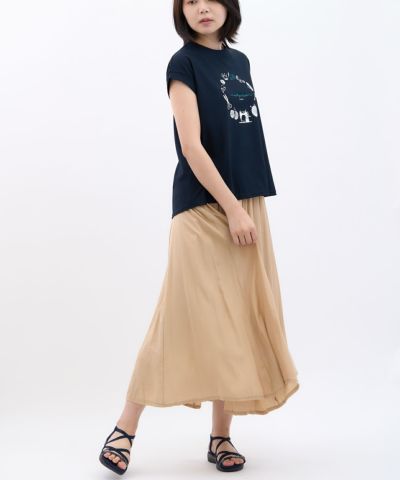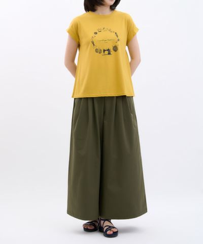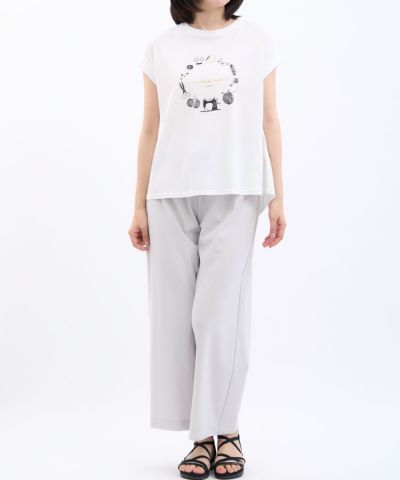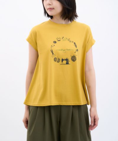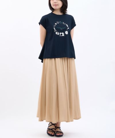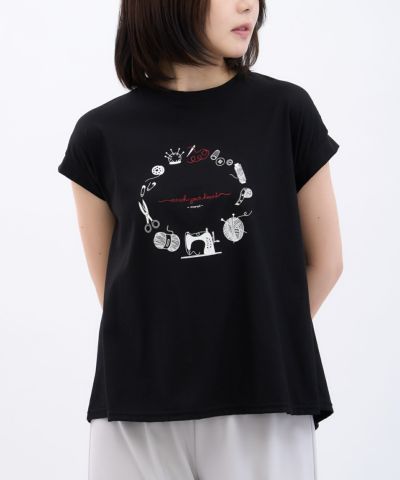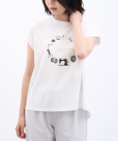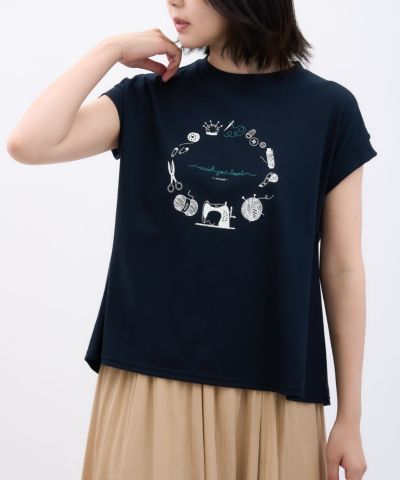 接触冷感素材で、ひんやり涼しい日本製カットソー。 クールローレルという生地を使用。 特徴は、肌に触れると冷たく感じる接触冷感素材。 シルクを思わせるような光沢感も魅力。 洗濯を繰り返しても毛羽が少ないです。 フレンチスリーブですっきりとしたデザイン。 裁縫をイメージしたプリントに、糸を刺繍で表現した可愛らしいプリント。 裾は前後で着丈をかえ、前はバランスを取りやすい丈、後ろは長めで安心感のある、ヒップが隠れる長さです。