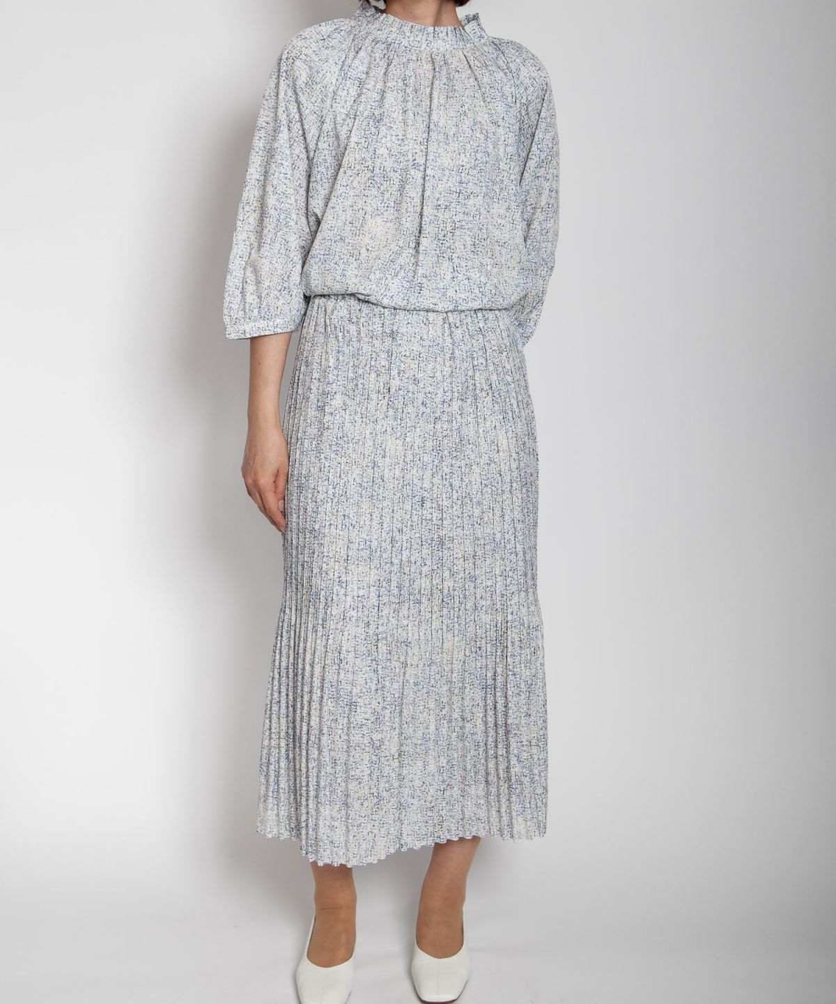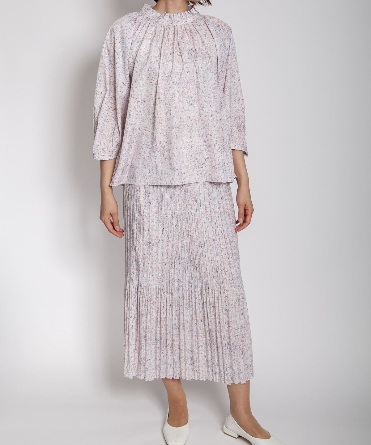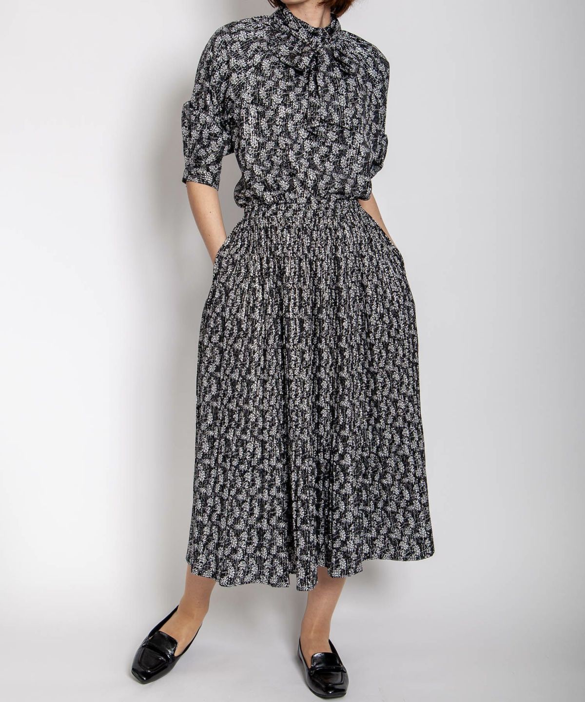 デシン箔入りプリントボウタイブラウス