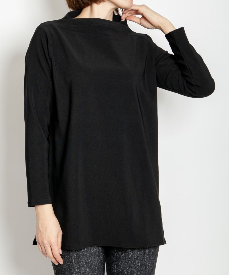ワイドハイネックで襟元すっきりチュニックは、首元がすっきりとした印象に。