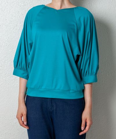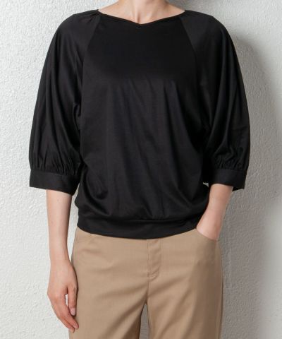 【デザイン】 襟元のギャザーと袖口のギャザーがポイント。ゆったりシルエットで体型を選びません。 Vネック、クルーネック、前後どちらでも着用頂け、2種類のネックラインを楽しめます。 裾に切替を入れ、ボリュームのあるボトムス、細身のテーパードパンツ、どちらでも相性良く合わせて頂けます。