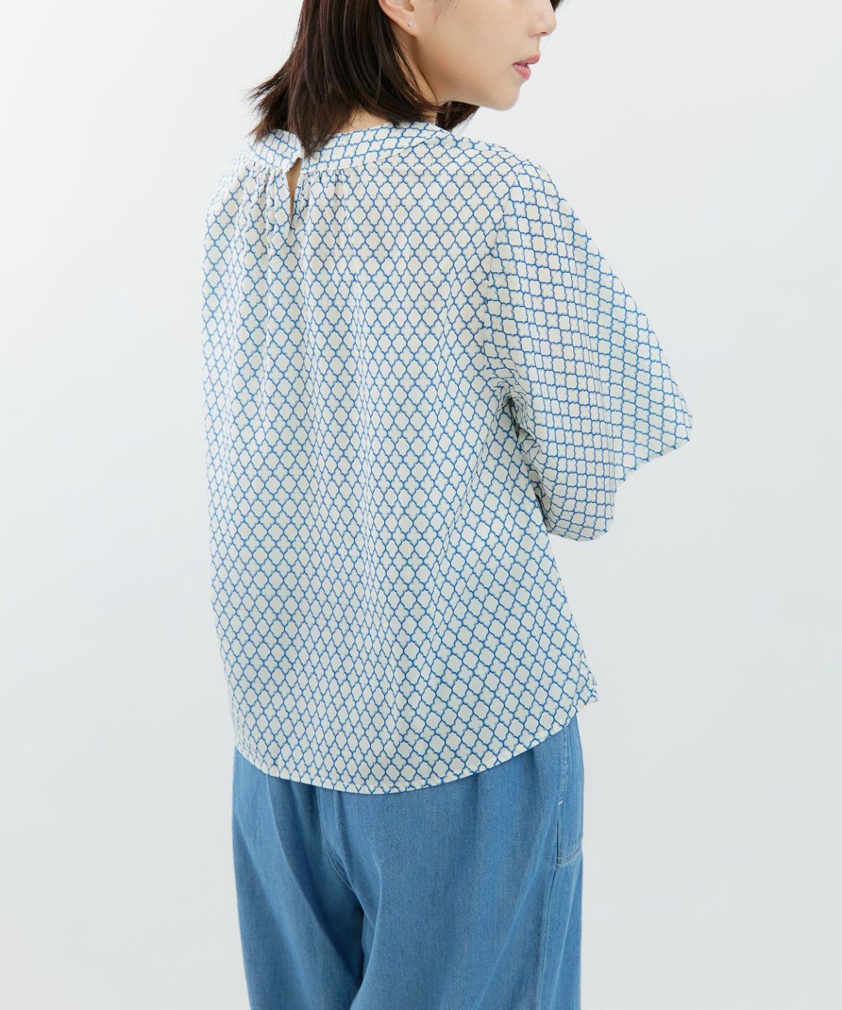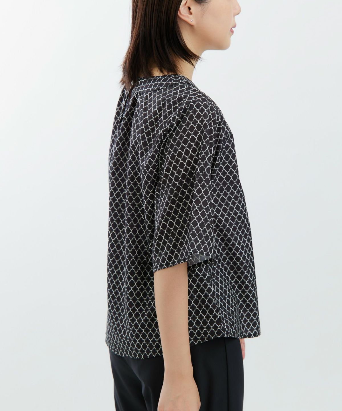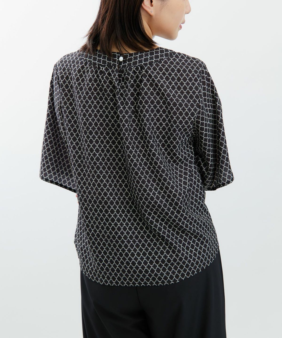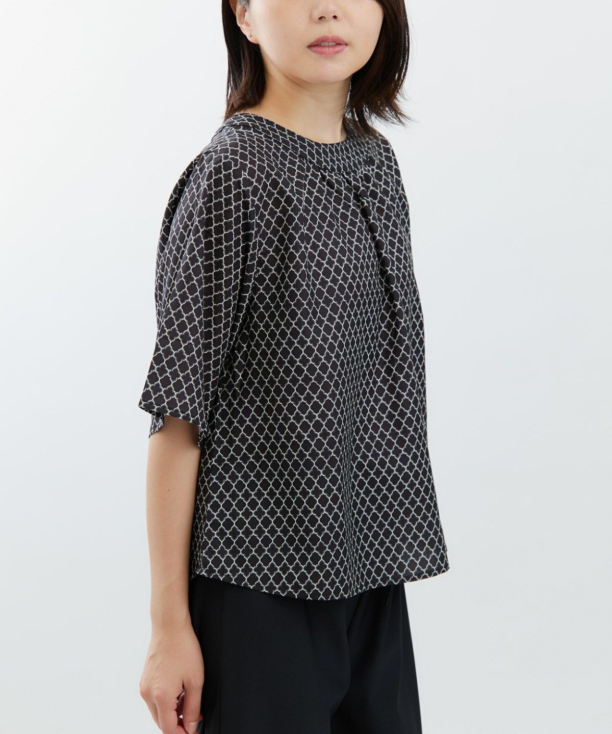 デシン箔入りプリントボウタイブラウス