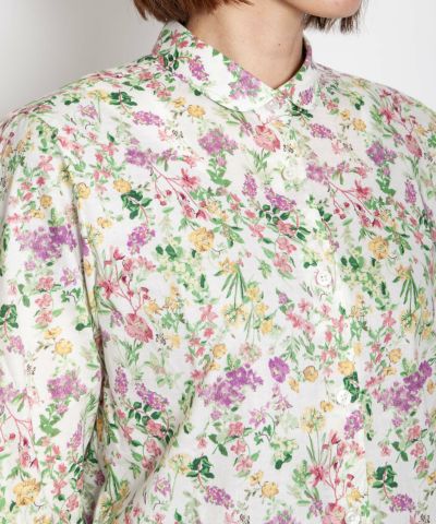 丸衿が可愛らしいフラワープリントシャツ。 綿100%、日本製のシャツ。 デニムパンツやカラーパンツと色を合わせて、大人カジュアルスタイルがおすすめ。