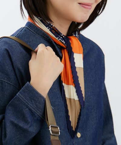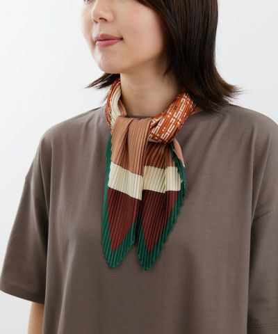 簡単にオシャレ度UPのプリーツスカーフ。 70cm×70cmのスカーフにプリーツ加工を施し、1巻きするだけでバランスの取れる形状。 シンプルなTシャツに巻くだけで、オシャレに。 まだクーラーの寒い季節や、気温の低下の際は、体温調整にも便利。 中央に細かいプリントを配し、首に1巻きすると、プリントと無地のコントラストが楽しめるデザインとなっています。