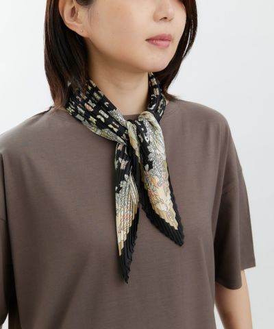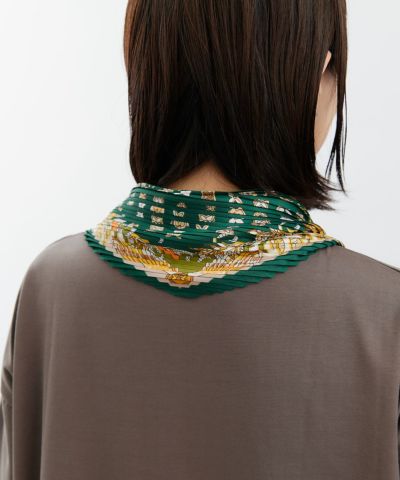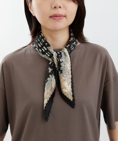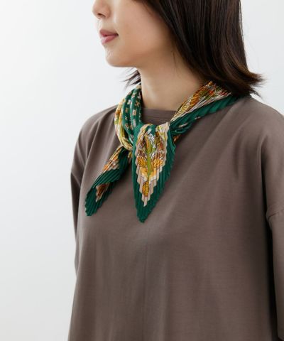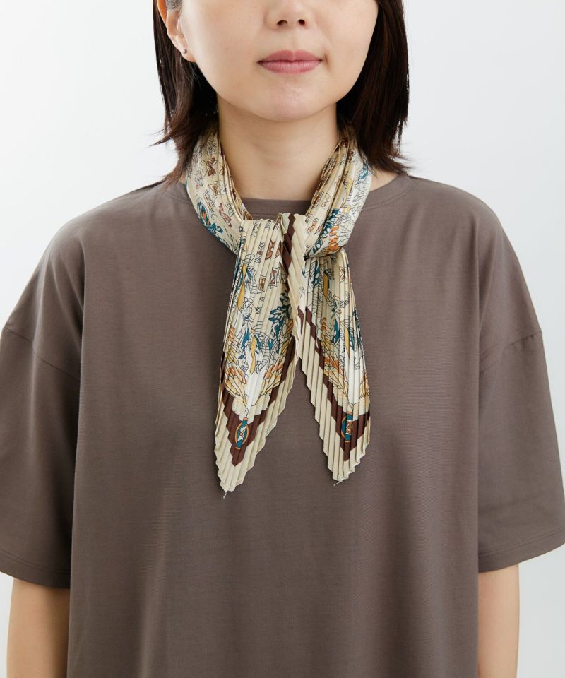 簡単にオシャレ度UPのプリーツスカーフ。 70cm×70cmのスカーフにプリーツ加工を施し、1巻きするだけでバランスの取れる形状。 シンプルなTシャツに巻くだけで、オシャレに。 まだクーラーの寒い季節や、気温の低下の際は、体温調整にも便利。 メインのプリントに幾何柄を使用し、周りに少し大きめのプリントを配したことで、総柄でもどこか柔らかな印象に。 クラシカルな雰囲気で、色を様々使っていても、合わせやすいスカーフです。