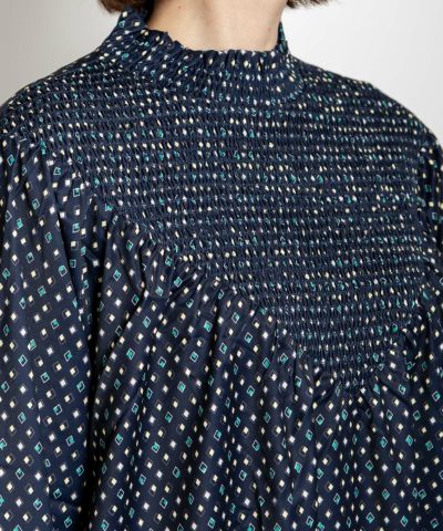 ハイネックのギャザーは締め付けを感じず、暖かい季節も着心地良く。