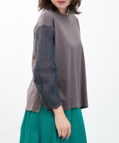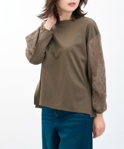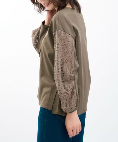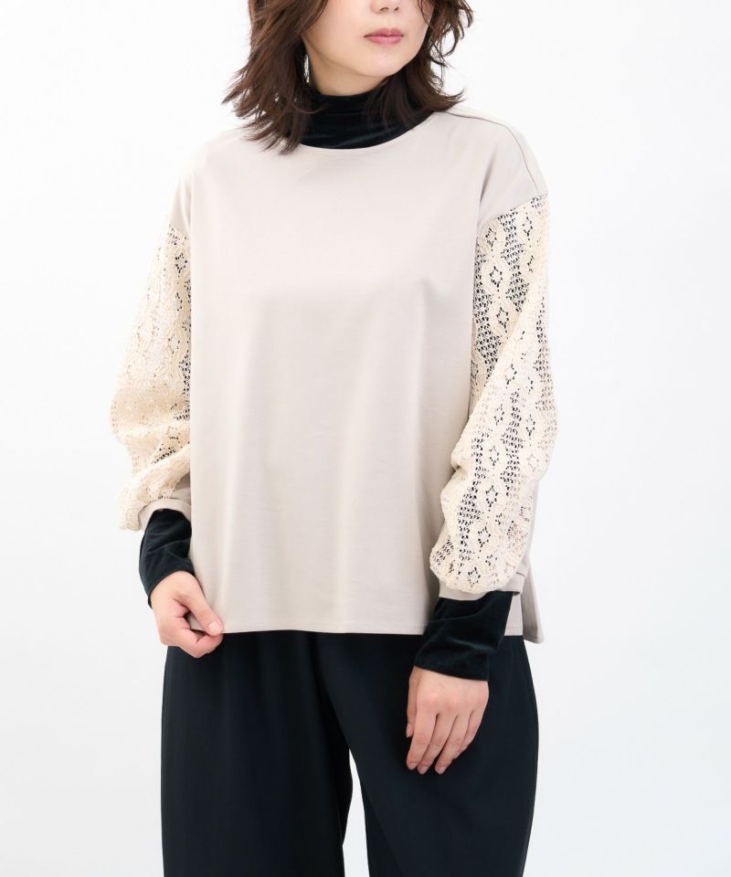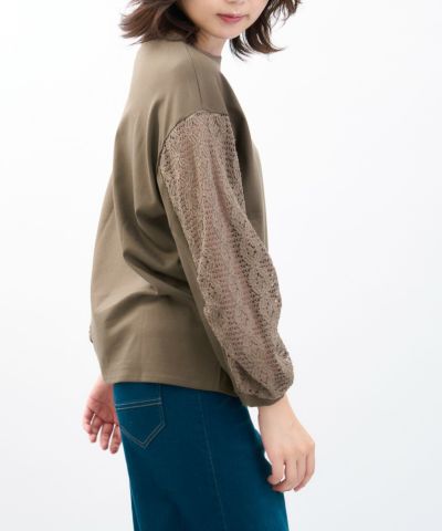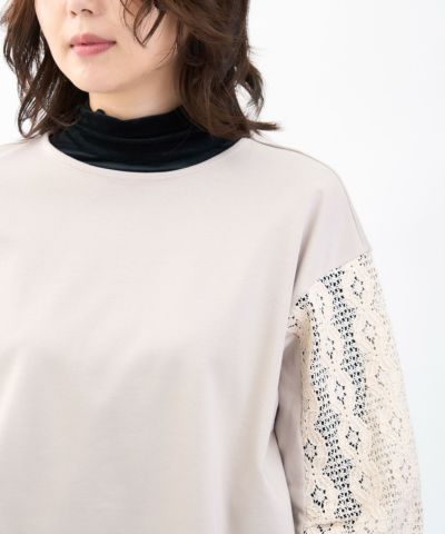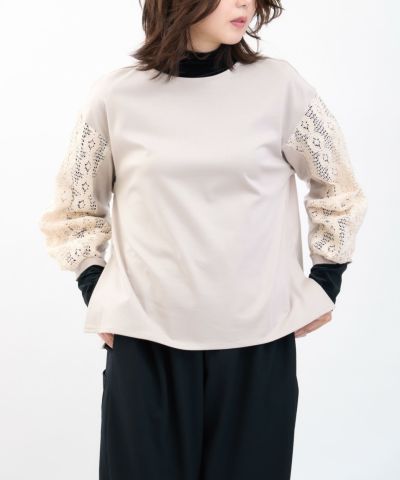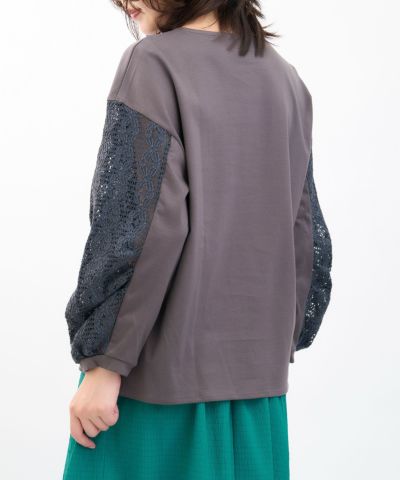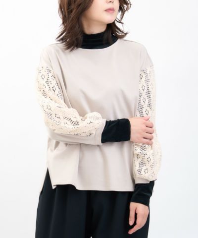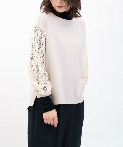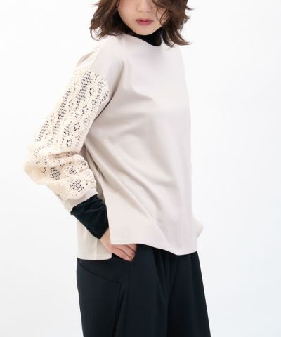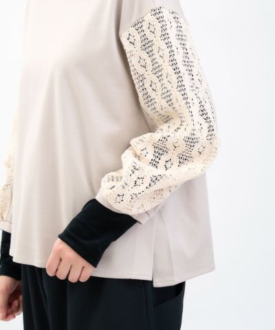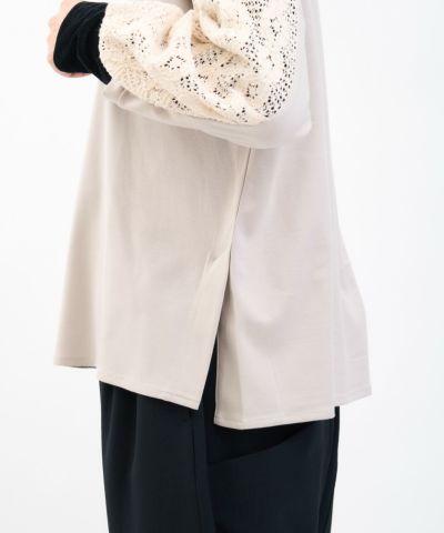 袖レースデザインが、一枚で着映えるプルオーバー。 肌触りが良いコットンポンチの、適度なハリとストレッチ性に優れた、動きやすい素材。 スポーティーでカジュアルさもありながら、袖にレースの切替をつけ、優しくフェミニンな印象をプラス。 秋口は一枚で着れば、袖から空気も出入りし、少し暑さの残る季節にピッタリ。 インナーにハイネックを重ねれば、レースの袖のコントラストを楽しみつつ、長い季節楽しめます。 身幅はゆったりめで、裾にスリットを入れ、楽に着用出来るデザインです。