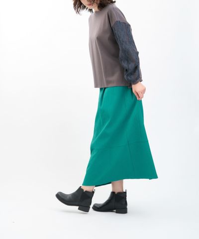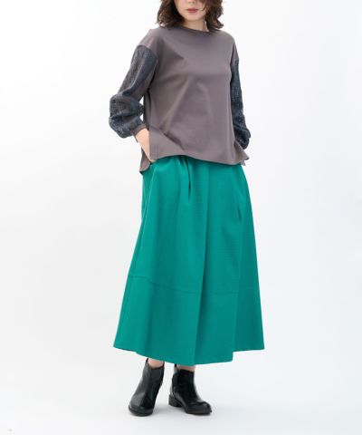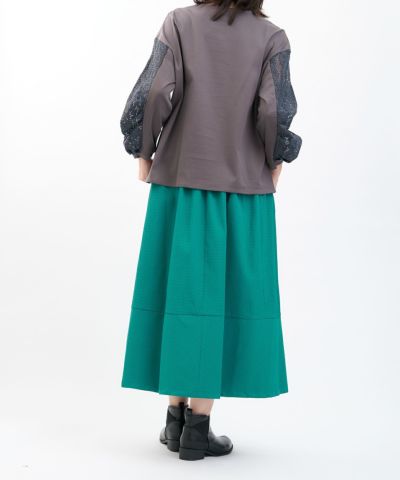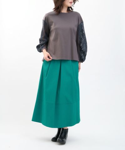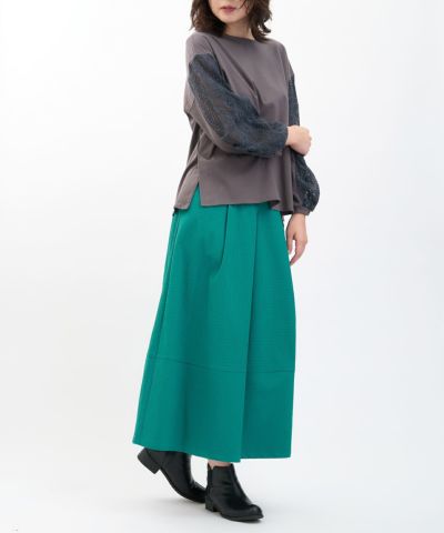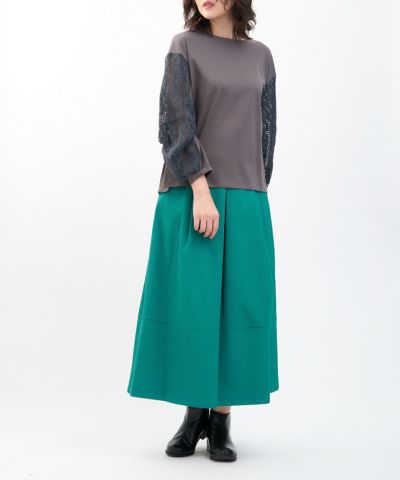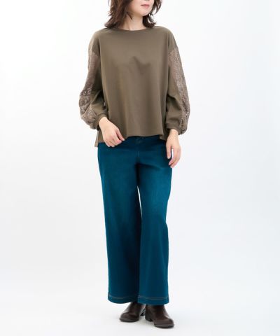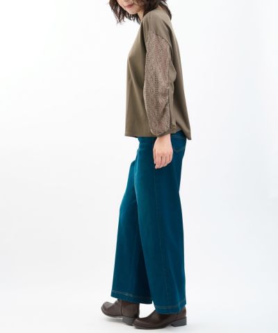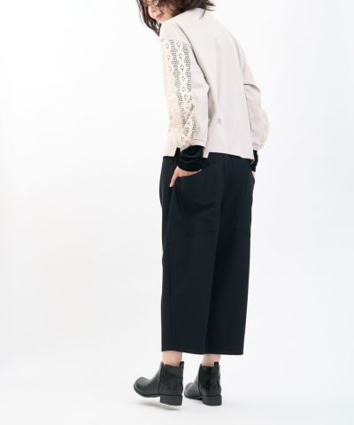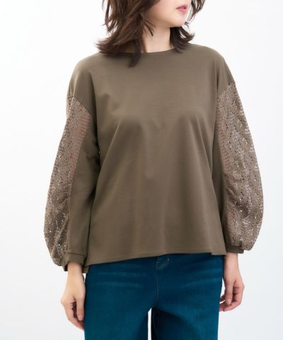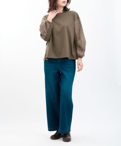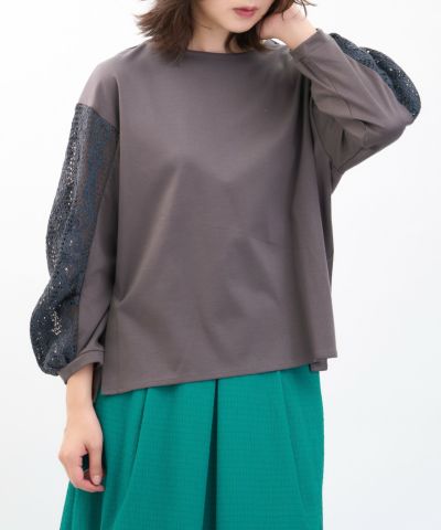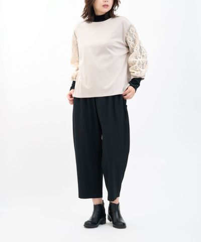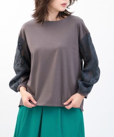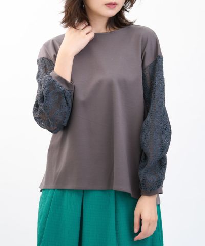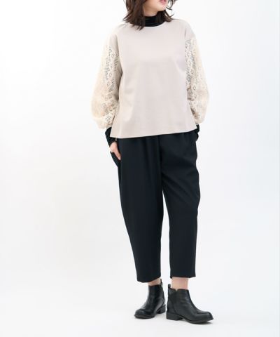 袖レースデザインが、一枚で着映えるプルオーバー。 肌触りが良いコットンポンチの、適度なハリとストレッチ性に優れた、動きやすい素材。 スポーティーでカジュアルさもありながら、袖にレースの切替をつけ、優しくフェミニンな印象をプラス。 秋口は一枚で着れば、袖から空気も出入りし、少し暑さの残る季節にピッタリ。 インナーにハイネックを重ねれば、レースの袖のコントラストを楽しみつつ、長い季節楽しめます。 身幅はゆったりめで、裾にスリットを入れ、楽に着用出来るデザインです。