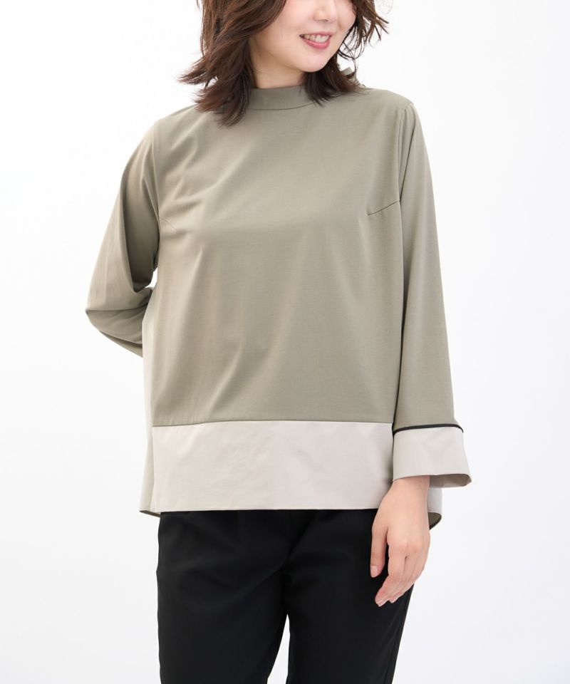 カラー配色と、異素材コンビがオシャレなプルオーバー。 首周りにもゆとりがある、襟が高すぎないモックネックが上品。 滑らかなタフタ素材と少し光沢のあるポリエステル素材をドッキングし、色の配色だけでなく、異素材のMIXも楽しめます。 着丈は、後ろの長さが、ヒップがすっぽりと隠れる着丈で安心感あり。 細身のシルエットのパンツと組み合わせると、メリハリのあるスタイルに。
