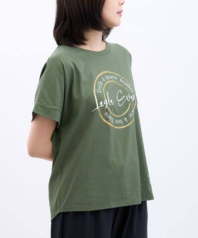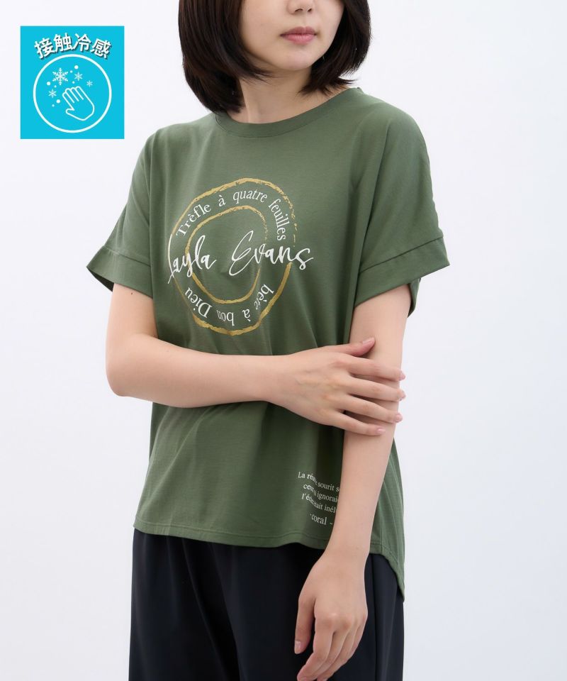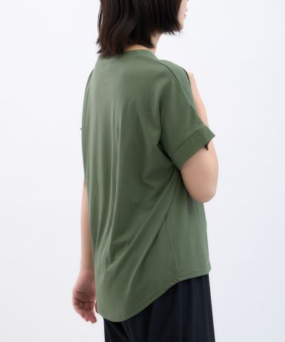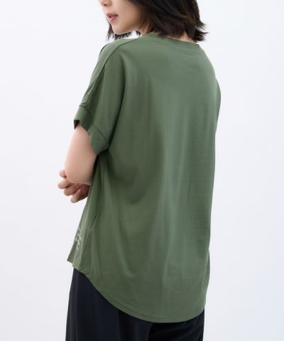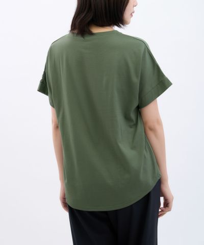 接触冷感素材で、ひんやり涼しい日本製カットソー。 クールローレルという生地を使用。 特徴は、肌に触れると冷たく感じる接触冷感素材。 シルクを思わせるような光沢感も魅力。 洗濯を繰り返しても毛羽が少ないです。 シルエットは肩に切替をつけず、袖口は広めにすることで、空気も入りやすい仕様に。 前裾は真っ直ぐで、後ろの裾はカーブをつけ、ヒップに被る位でメリハリを付けています。 前をインしなくても、バランスの取りやすいデザインです。