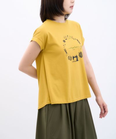 接触冷感素材で、ひんやり涼しい日本製カットソー。 クールローレルという生地を使用。 特徴は、肌に触れると冷たく感じる接触冷感素材。 シルクを思わせるような光沢感も魅力。 洗濯を繰り返しても毛羽が少ないです。 フレンチスリーブですっきりとしたデザイン。 裁縫をイメージしたプリントに、糸を刺繍で表現した可愛らしいプリント。 裾は前後で着丈をかえ、前はバランスを取りやすい丈、後ろは長めで安心感のある、ヒップが隠れる長さです。