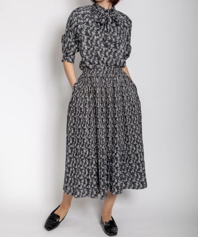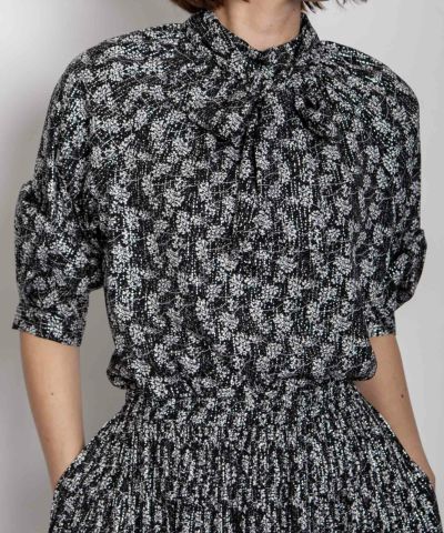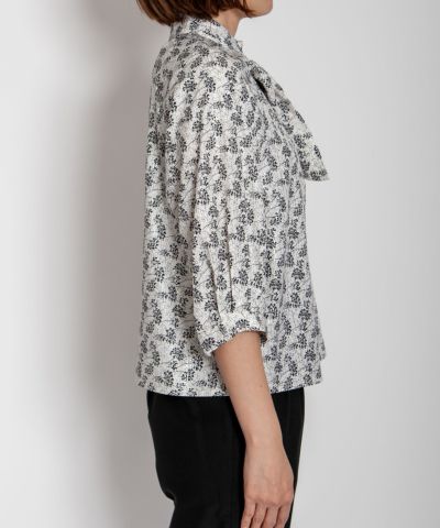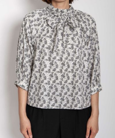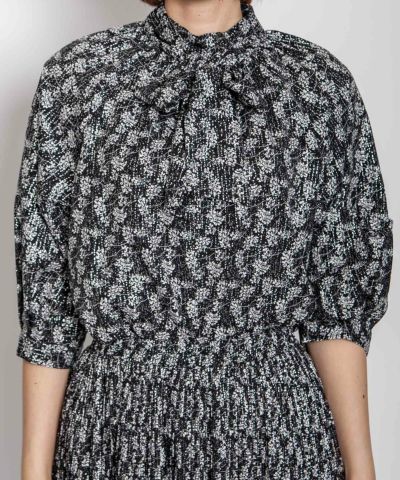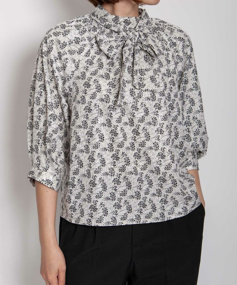 箔入りプリントが大人なリボンタイブラウス。 きらりと光る箔プリントが華やかさをUP。