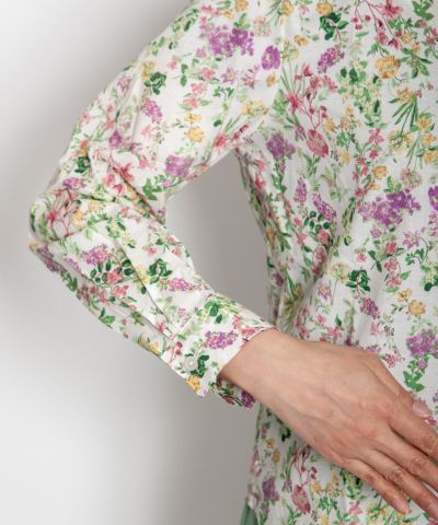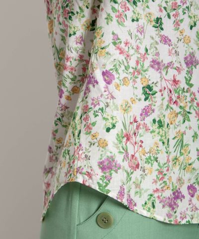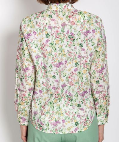 丸衿が可愛らしいフラワープリントシャツ。 綿100%、日本製のシャツ。 デニムパンツやカラーパンツと色を合わせて、大人カジュアルスタイルがおすすめ。