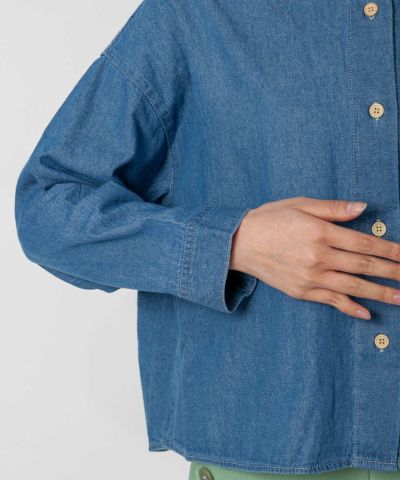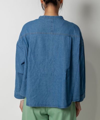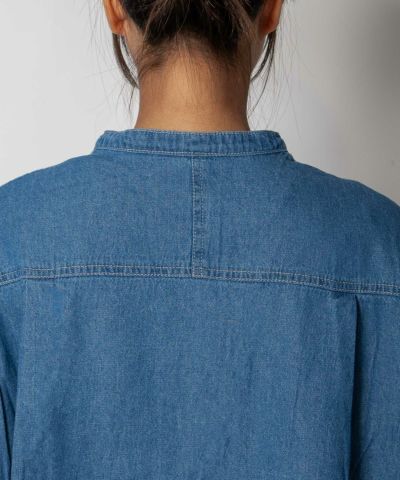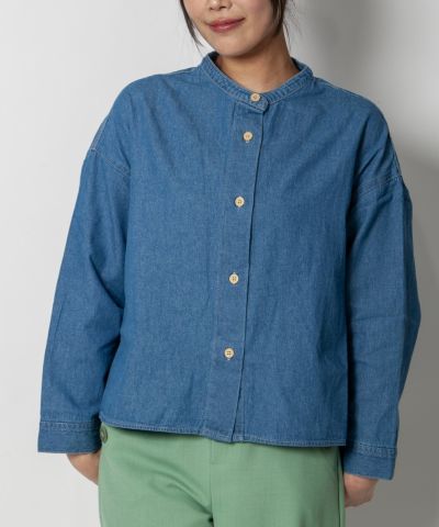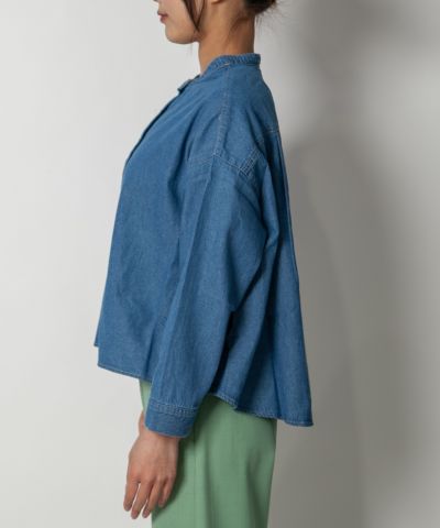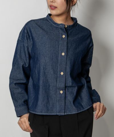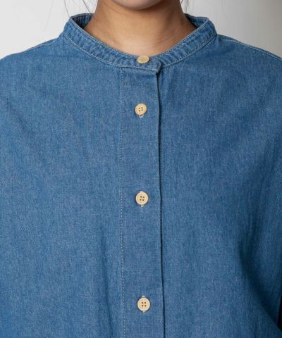 コンパクトなスタンドカラーのデニムシャツ。 シンプルで合わせやすいデザイン。 着丈は前後に差があり、軽い印象に。 ボトムにきれいめなロングスカートを合わせたミックススタイルや、デニムパンツと上下をデニム合わせにするのもオススメ。 釦が木目調になっており、さりげなくおしゃれに。