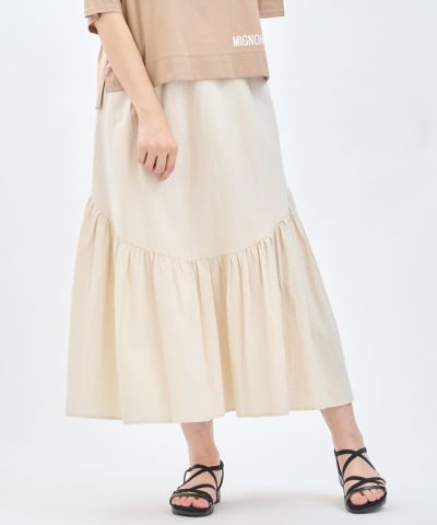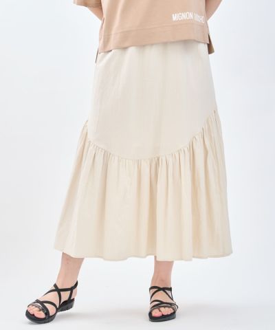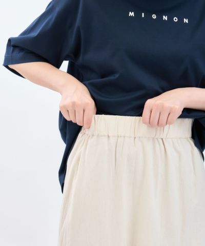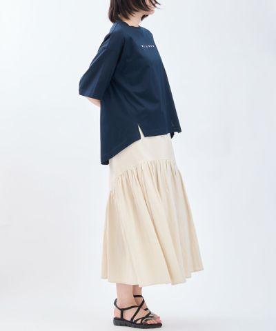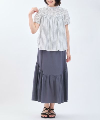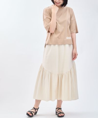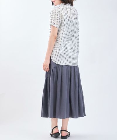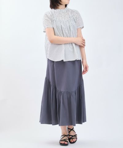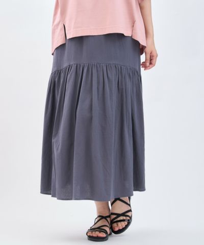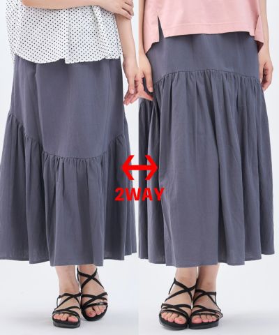 前後2WAY使用のロングスカート。 ギャザーの切替位置を、高めと低めに前後で差をつけ、両面とも着られる仕様に。 表面変化が楽しめる、凹凸感の出る、エンボス加工素材。 ウエストゴムで楽々。 シンプルなTシャツや、フェミニンにブラウスと合わせるのも素敵です。