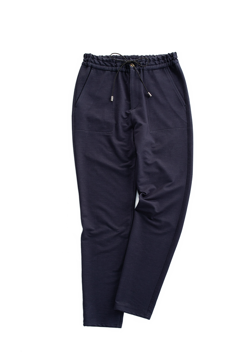 すっきりテーパードですが、 腿のあたりは余裕あり。 ウエストはゴムと紐使いで、 体型にフィットします。 オンにもオフにも活躍しそう!