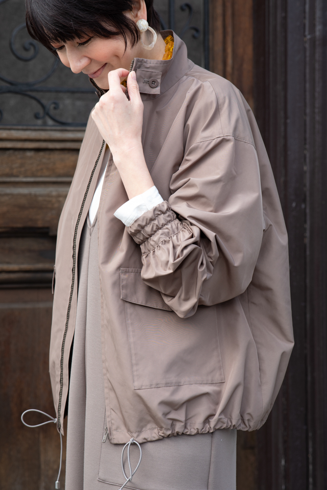 スポーティな印象のブルゾンながら、どこかフェミニンを感じる理由は素材にあります。やわらかさとハリ感をあわせもつ素材だから、たっぷりとした分量感のあるシルエットが作れます。さらに特別な撥水加工により、品のよい光沢が生かされているのも上質ポイント。大人のカジュアルスタイルのポイントは、素材感とミックススタイルです。