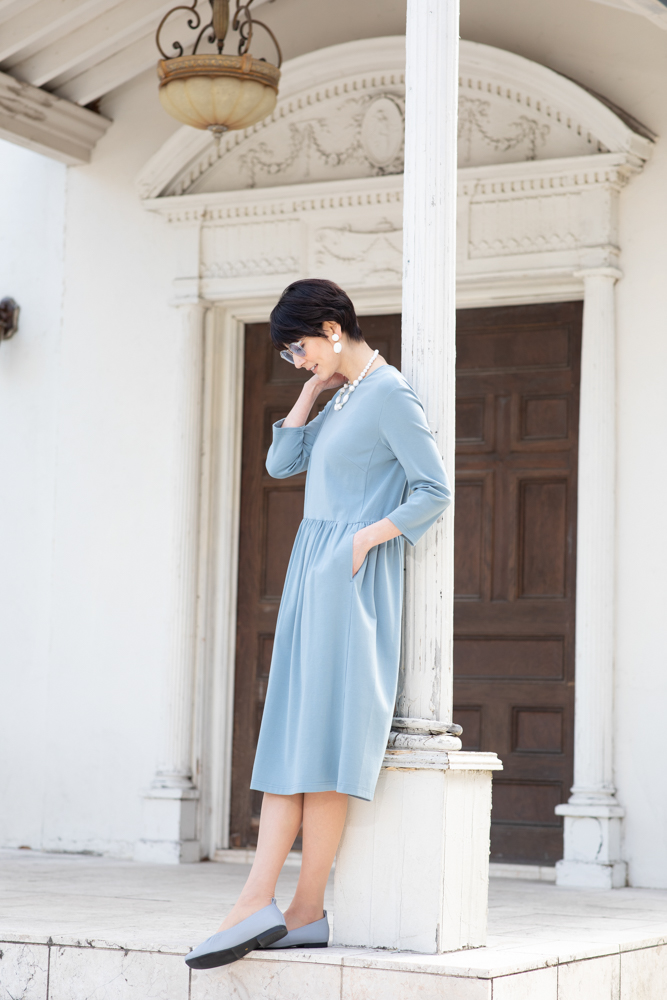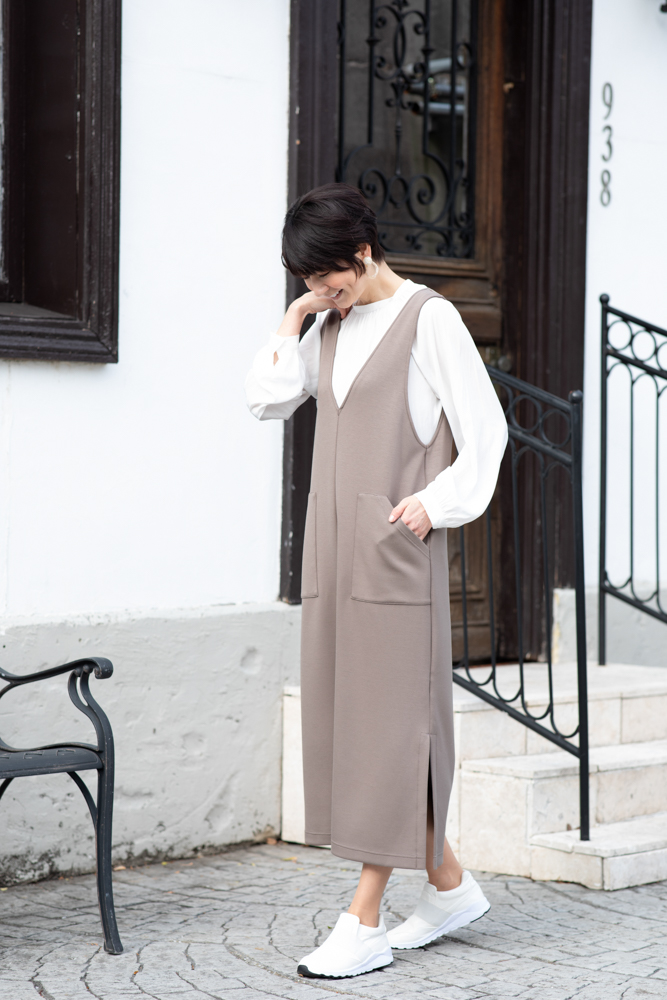 コートインのワンピースは、天然由来のモダールをブレンドした、なめらかな肌触りのジャージ素材。体のラインを拾わないように作りました。お出かけにも、リラックスにも、シーンを選ばず着られます。