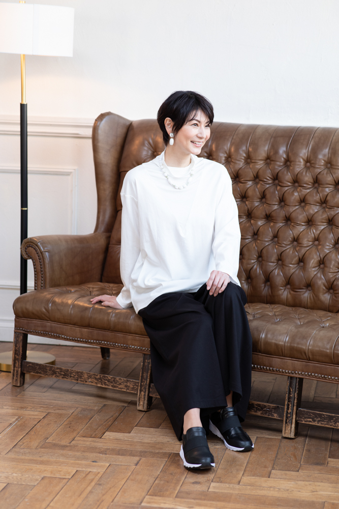 なめらかな落ち感が快適・キレイなセットアップ。カットソーはゆったりとしたシルエットに、あえて深くぬいたⅤゾーンがフェミニンな印象に。やわらかな素材を組み合わせることで、首元をやさしく包み込むようなデザインにしました。合わせたパンツのシルエットも秀逸。キレイで楽は何よりうれしい。