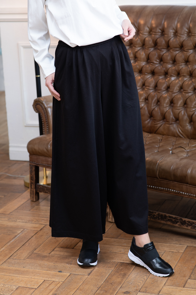 楽ちんスムース素材のパンツは、前タック、後ろゴムで、体型を選ばずきれいにはけるシルエットです。