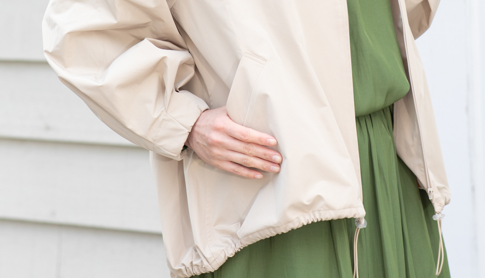 胸元のシームポケット、袖口にゴムを見せない仕様。さりげないポイントが隠れています。