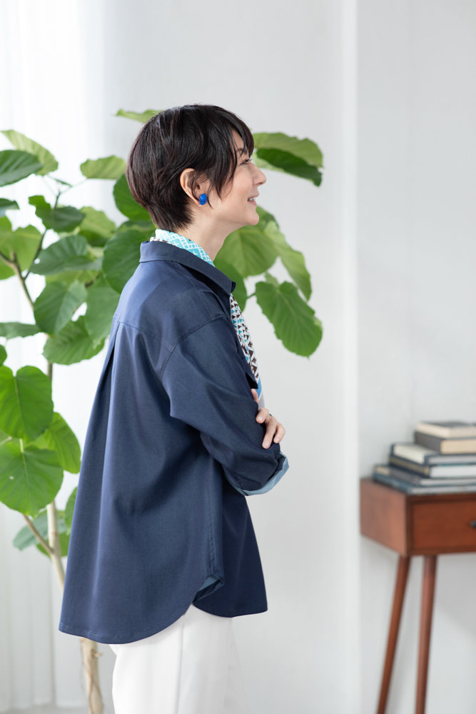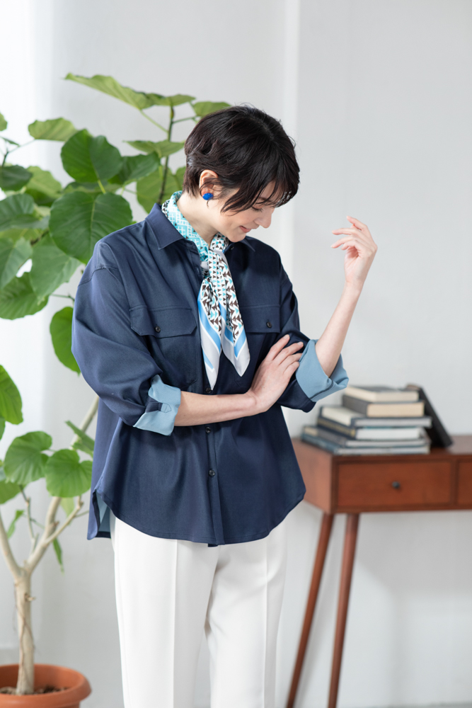大き目の胸ポケットでスポーティな印象のデニム見えシャツは、落ち感があるなめらか素材で仕上げました。テンセルという植物由来の素材にストレッチをブレンド。品のよい光沢としなやかな肌ざわりです。